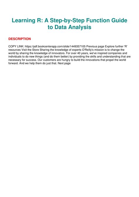 Download Learning R A Step-by-Step Function Guide to Data Analysis PDF online is a convenient and frugal way to read Learning R A Step-by-Step Function Guide to Data Analysis you love right from the comfort of your own home. Yes, there sites where you can get PDF "for free" but the ones listed below are clean from viruses and completely legal to use.